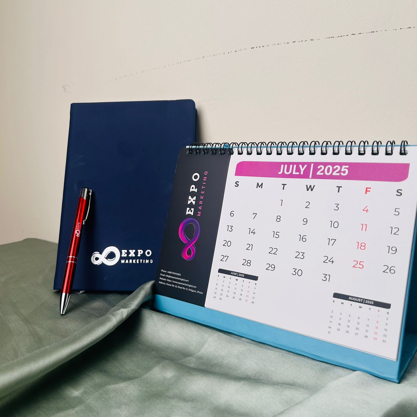 | 3. Desk Calendar | Size: 8 inches x 4 inches (Ideal for desks). Pages: 6 pages (Cover + 12 months). Material: Thick 300 GSM Art Card. | Finish: Wiro Binding (spiral) for easy page flipping. Print: High-definition Both Side Print (12-month display plus branding/graphics). |