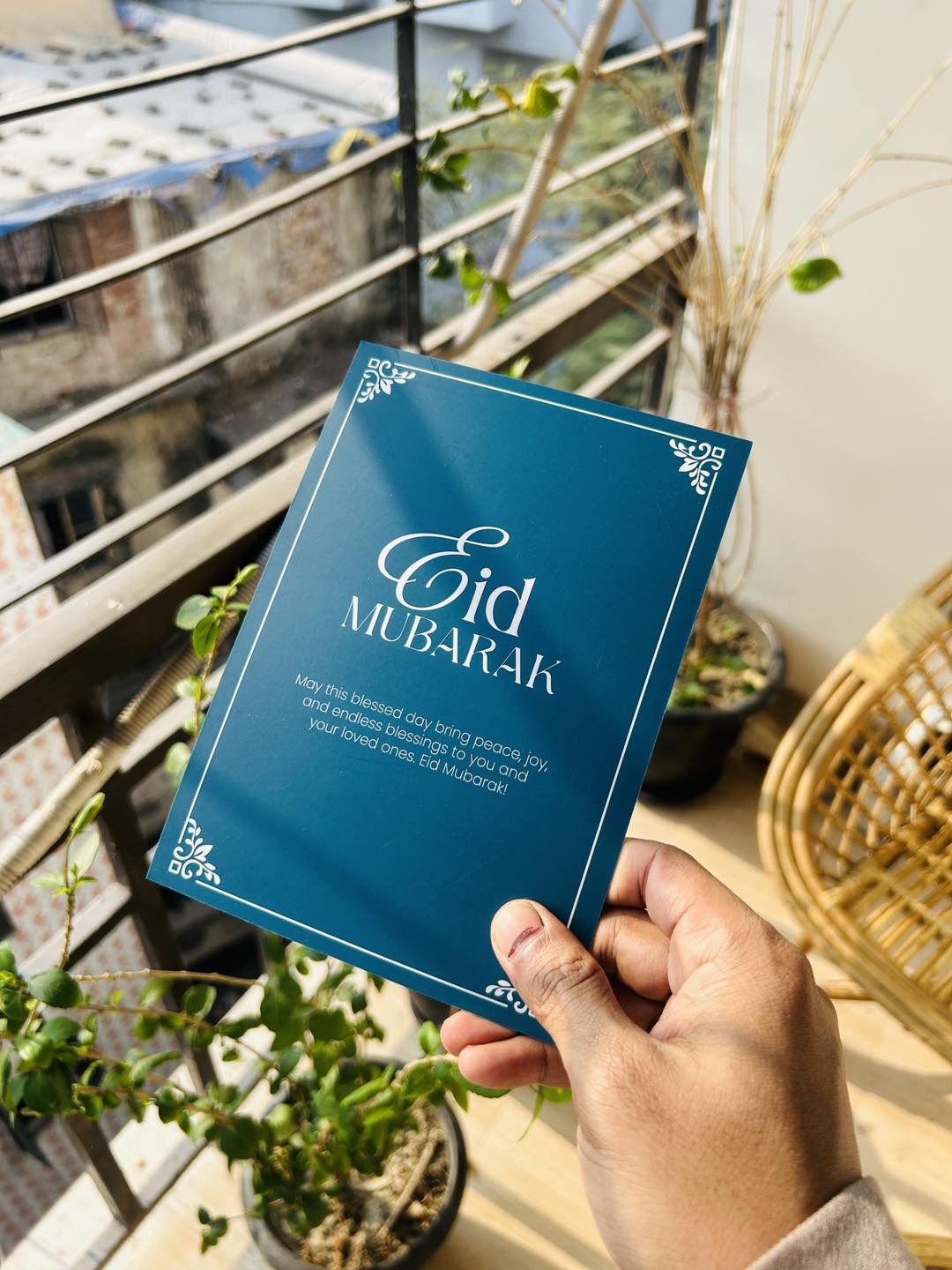 • Back: A heartfelt “Eid Mubarak” message with elegant typography and customizable space for your personal or brand message.