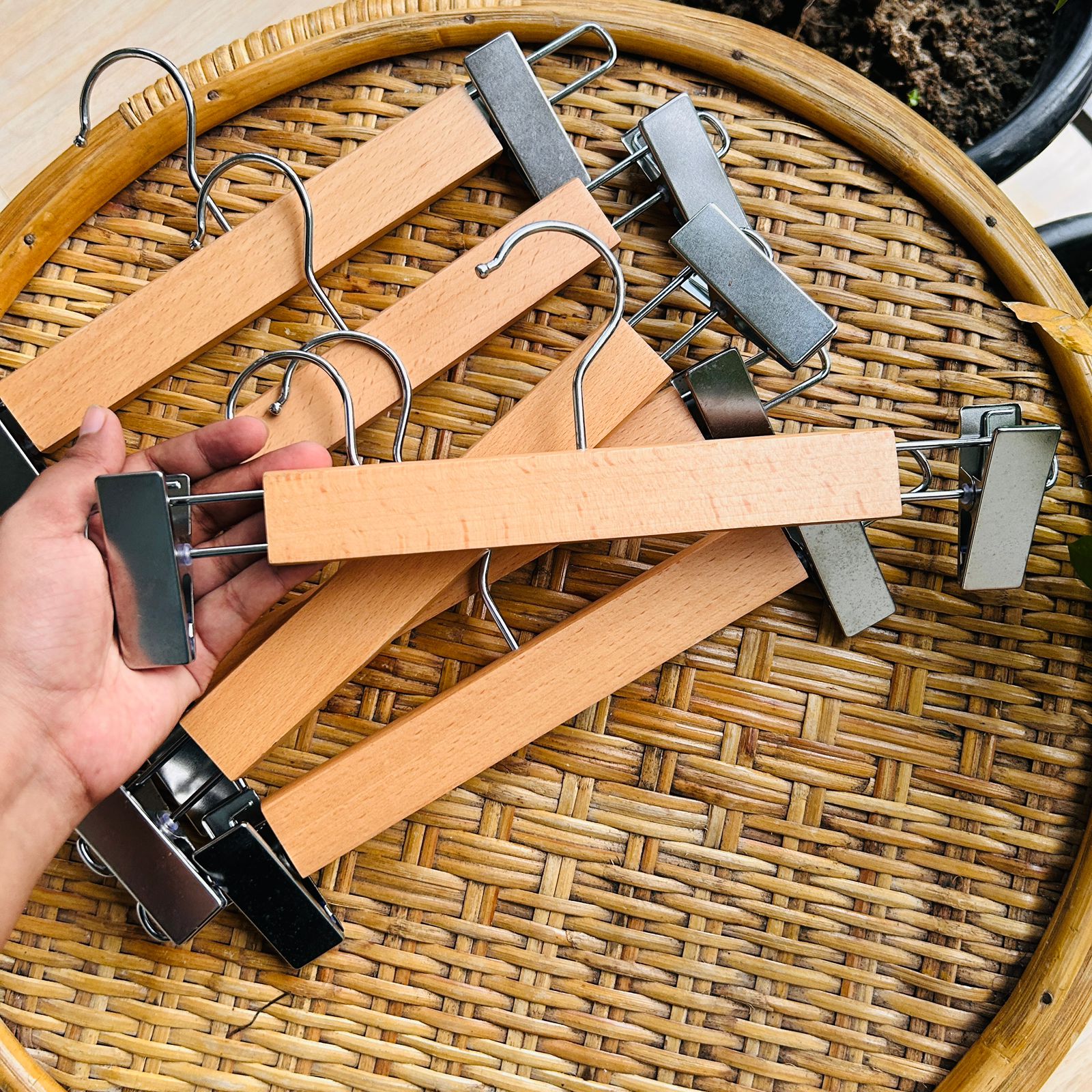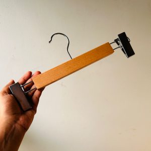 It is a device in the shape of a human shoulder or waist used to hang clothes on. Also, it is a wooden hanger, which makes it longer sustainable than the low-quality easily breakable plastic hangers.